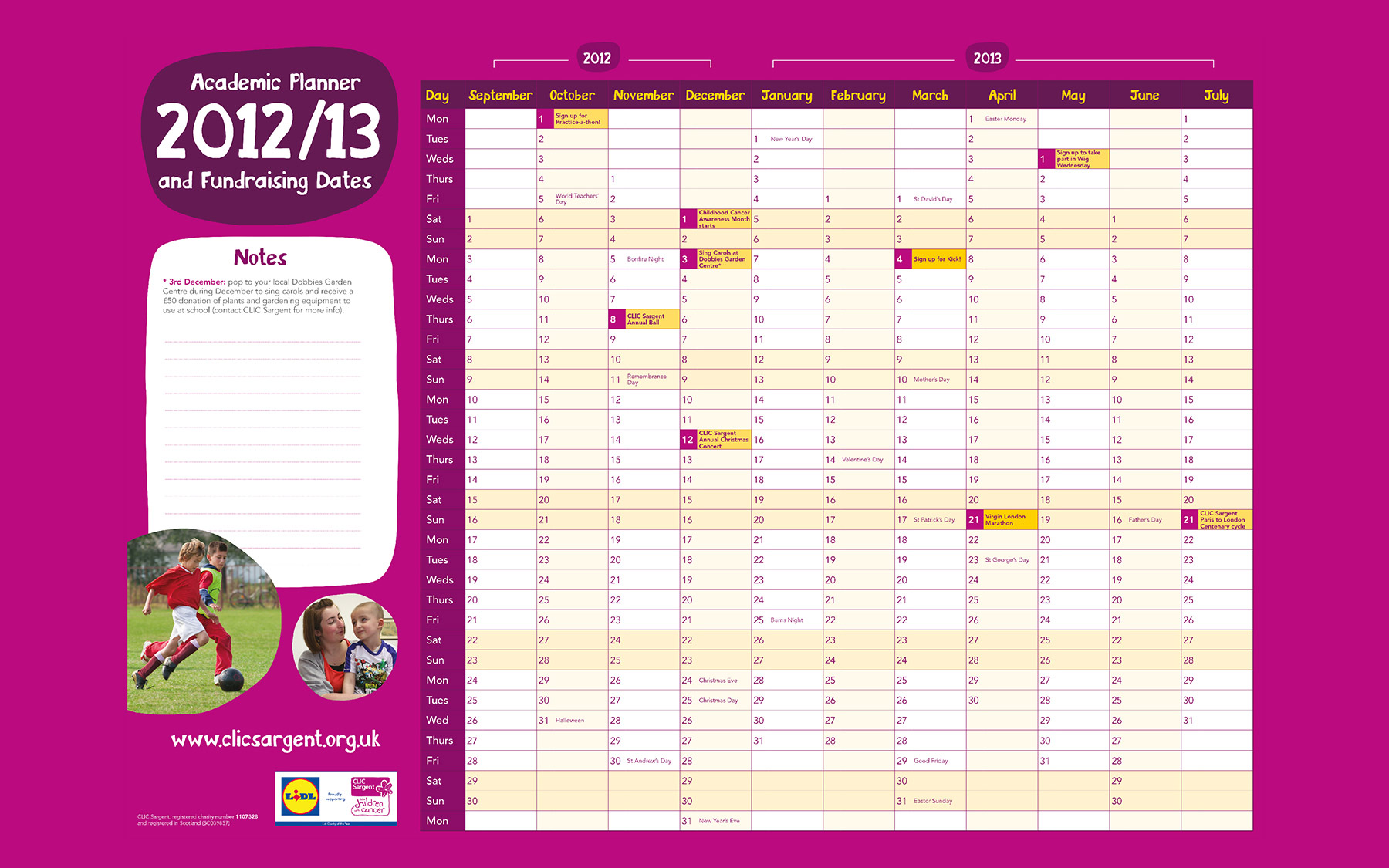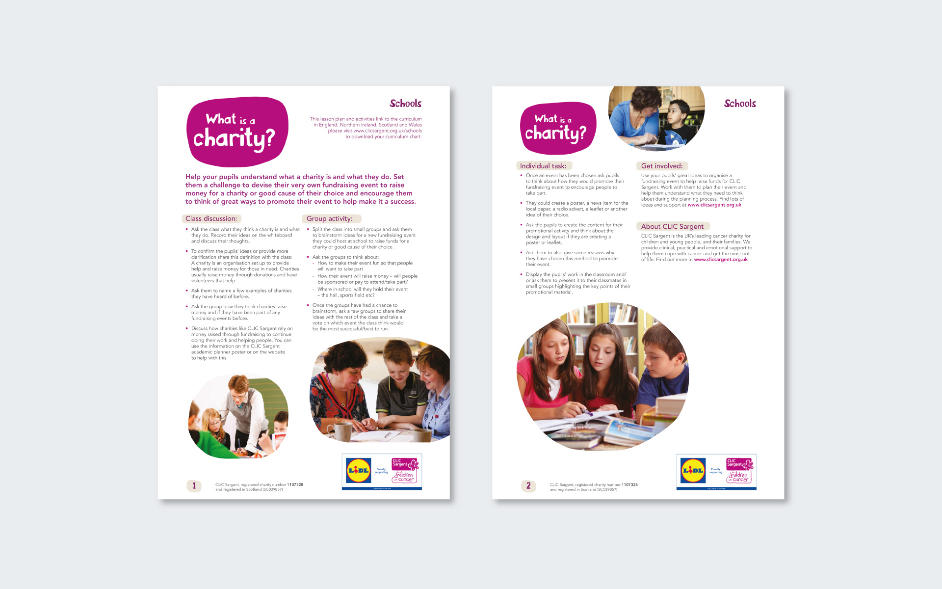 Based on their current guidelines and branding, I designed lesson plans, posters and calendars to go into schools. The aim to help children understand what a charity is, and help teachers help their students to devise their own fundraising event.