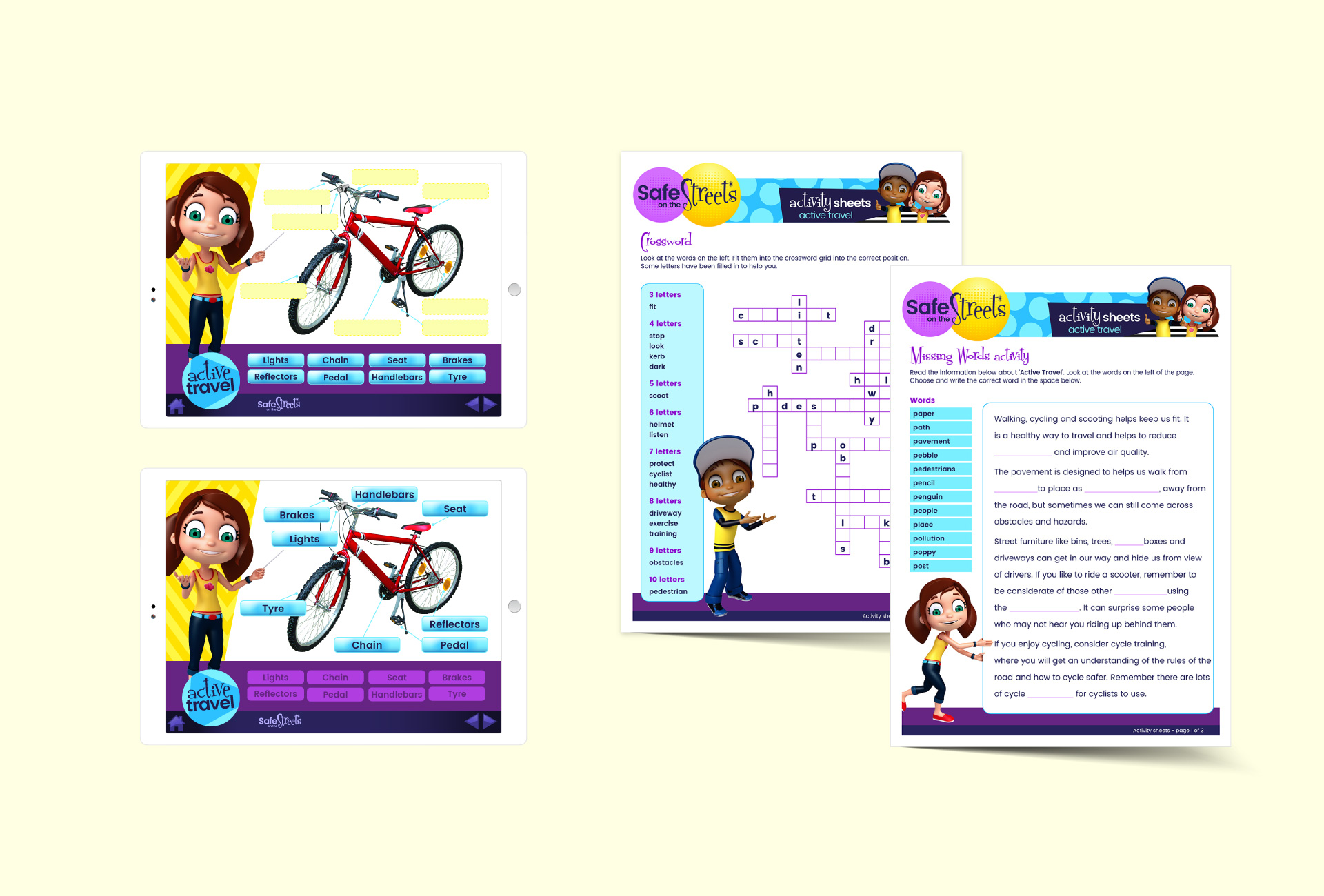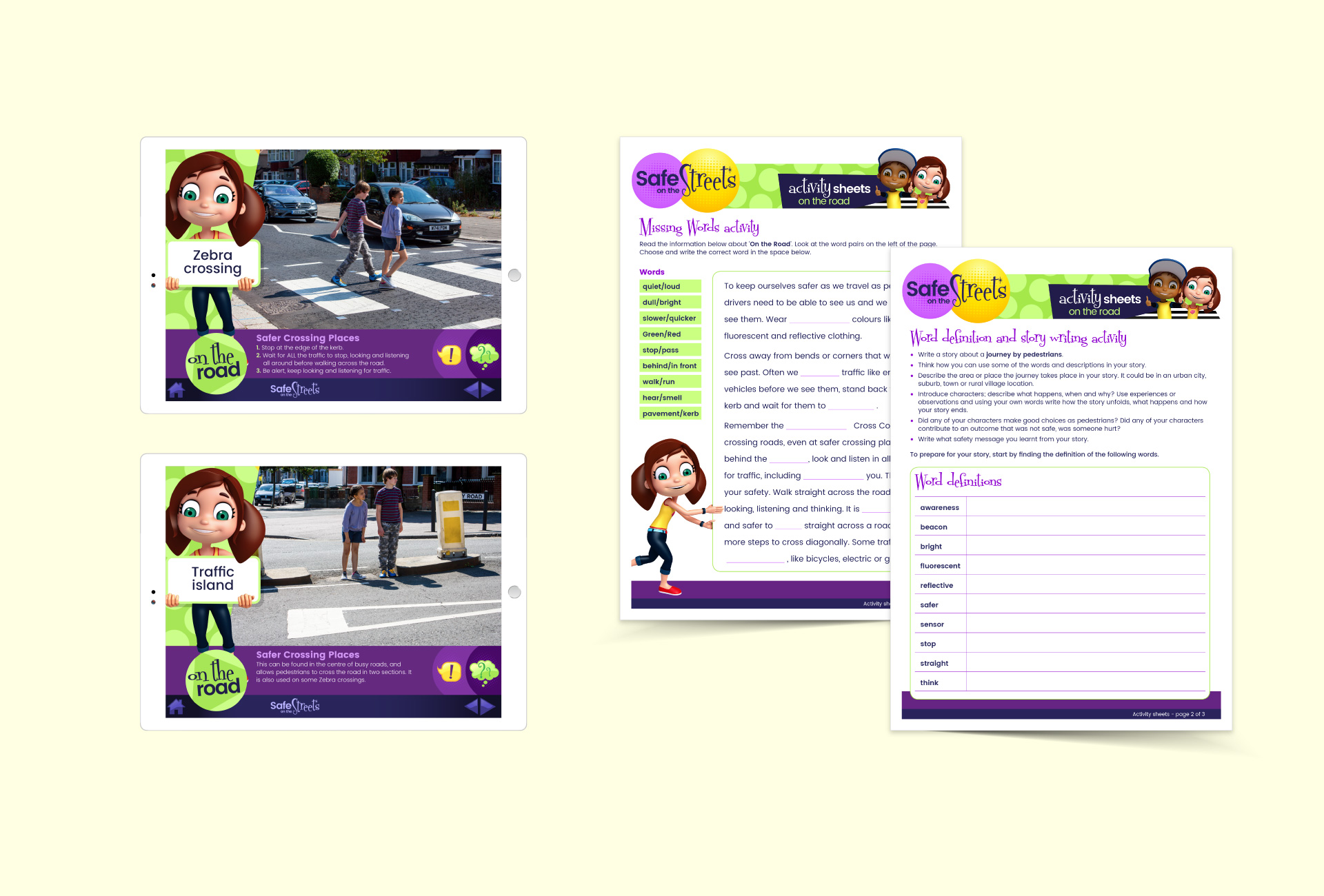 I compiled a list of photographs needed for each section and art directed the photoshoot to make sure we had all road safety elements covered. Alongside the interactive game, I designed the supporting downloadable teacher notes, quizzes and printable activity sheets plus the marketing material sent out to all schools. Showing below some of the interactive screens and pdfs available.