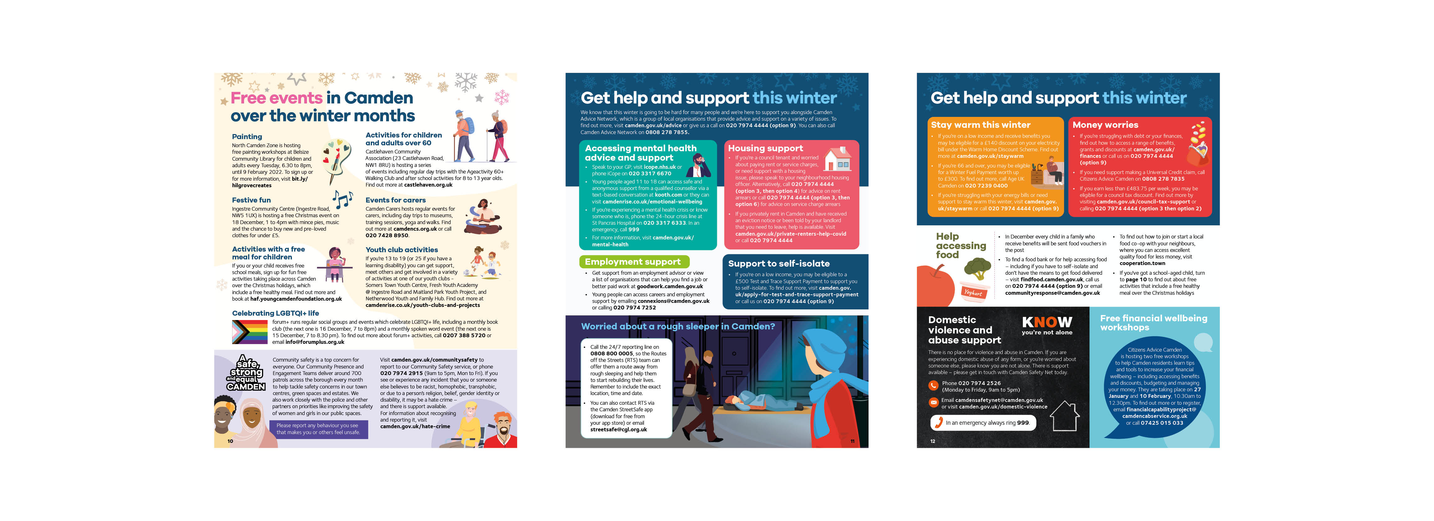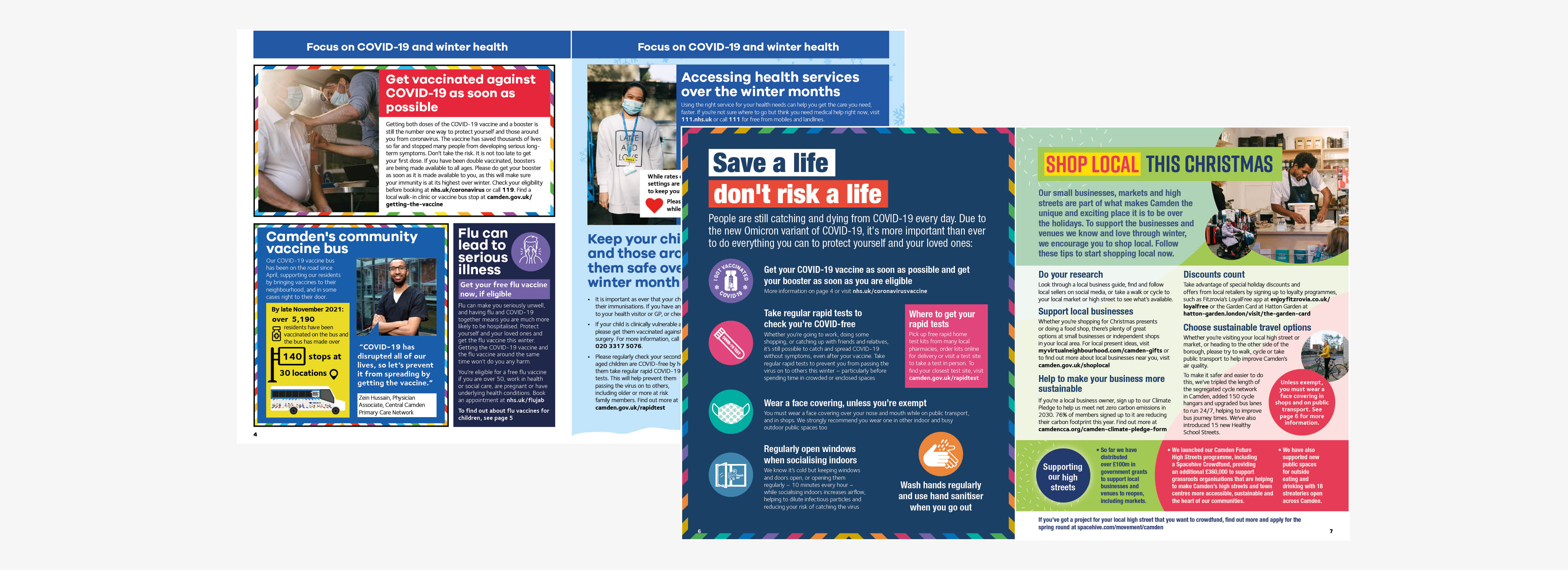 Design and layout of the full 2021 Winter Magazine, with a mixture of photos and illustrations, showing some spreads below.