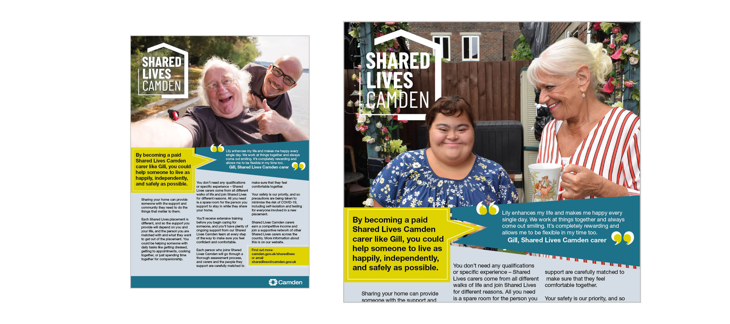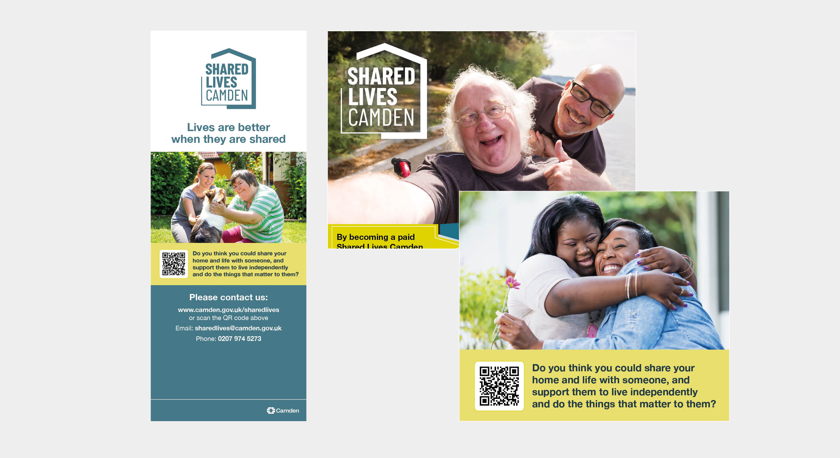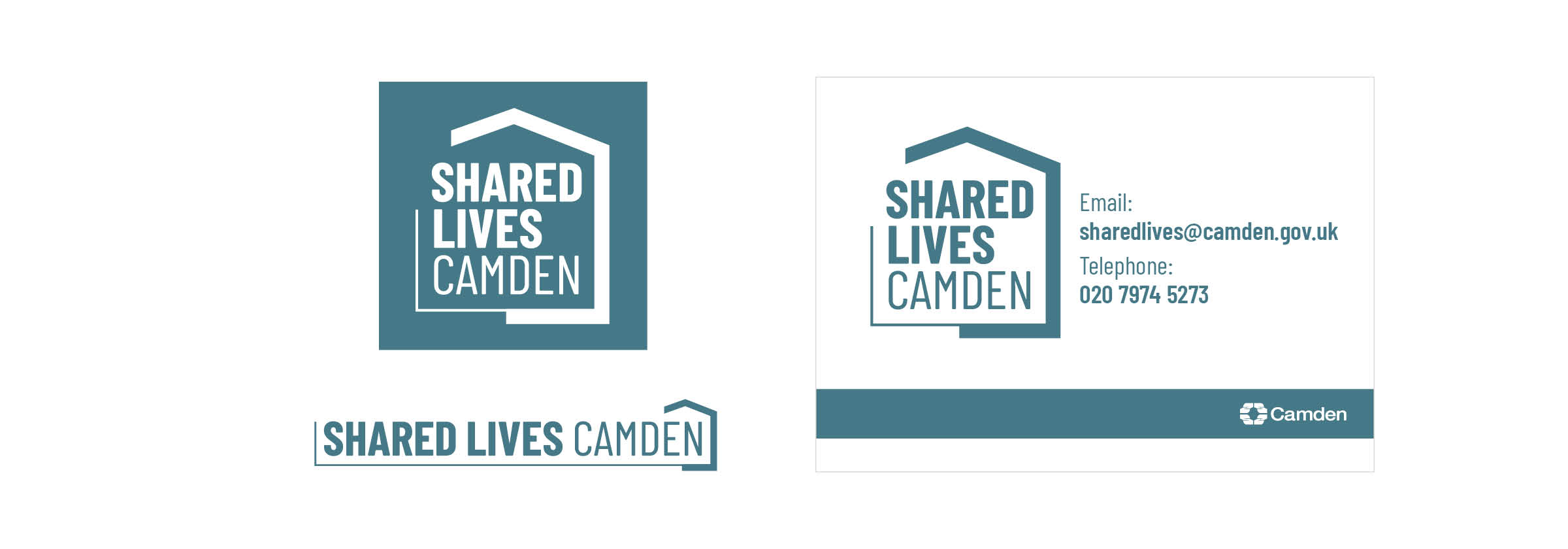 Logo, branding design and event material for a new campaign for Shared Lives - a way that people with learning disabilities or autism can get support and stay independent. Showing a few elements below.